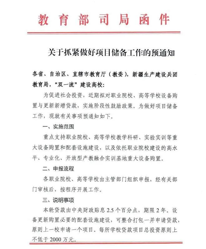 教育部司局近日發(fā)布函件《關于抓緊做好項目儲備工作的預通知》,為促進社會投資,近期擬對職業(yè)院校、高等學校設備購置與更新新增貸款,實施階段性鼓勵政策。