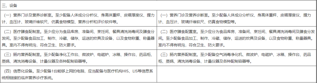 (四)信息化設備:至少配備1臺能夠上網(wǎng)的電腦,應當配備與醫(yī)療機構HIS、LIS等信息系統(tǒng)相鏈接的臨床營養(yǎng)診療系統(tǒng)。