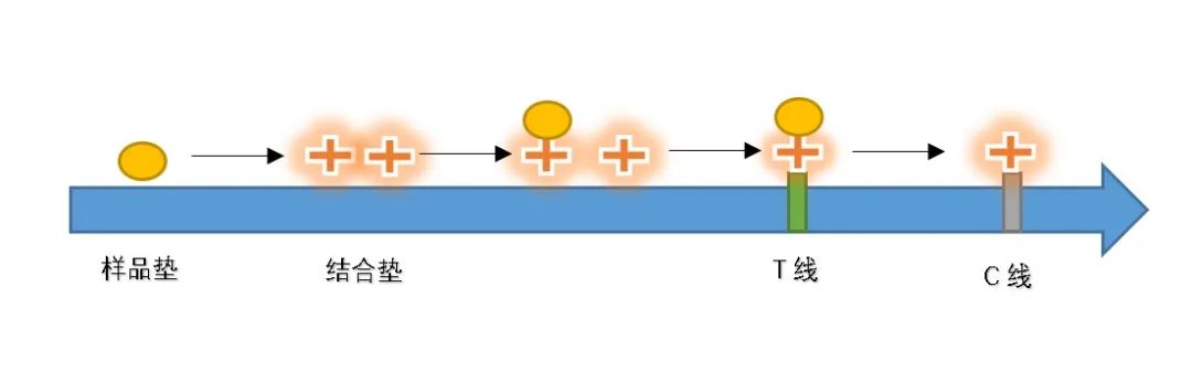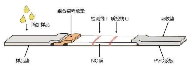 同時(shí),人們?cè)赥線、C線固定有不同的抗體,當(dāng)目標(biāo)出現(xiàn)時(shí),位于T線的抗體會(huì)拉住新冠病毒帶有有色蛋白質(zhì)的抗原抗體復(fù)合物,在樣品里病毒數(shù)量足夠多時(shí),會(huì)在T線處顯色。剩余的物質(zhì)繼續(xù)流動(dòng),與位于C線的抗體結(jié)合,用于判斷流動(dòng)過(guò)程(即層析過(guò)程)是否順利。