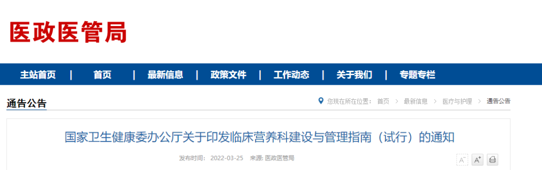 【更多】今年3月,國家衛(wèi)生健康委為指導和規(guī)范醫(yī)療機構臨床營養(yǎng)科建設與管理,組織起草了《臨床營養(yǎng)科建設與管理指南(試行)》,指南要求:所有二級以上綜合醫(yī)院以及腫瘤、兒童、精神等專科醫(yī)院,全部新增一個科室——臨床營養(yǎng)科。